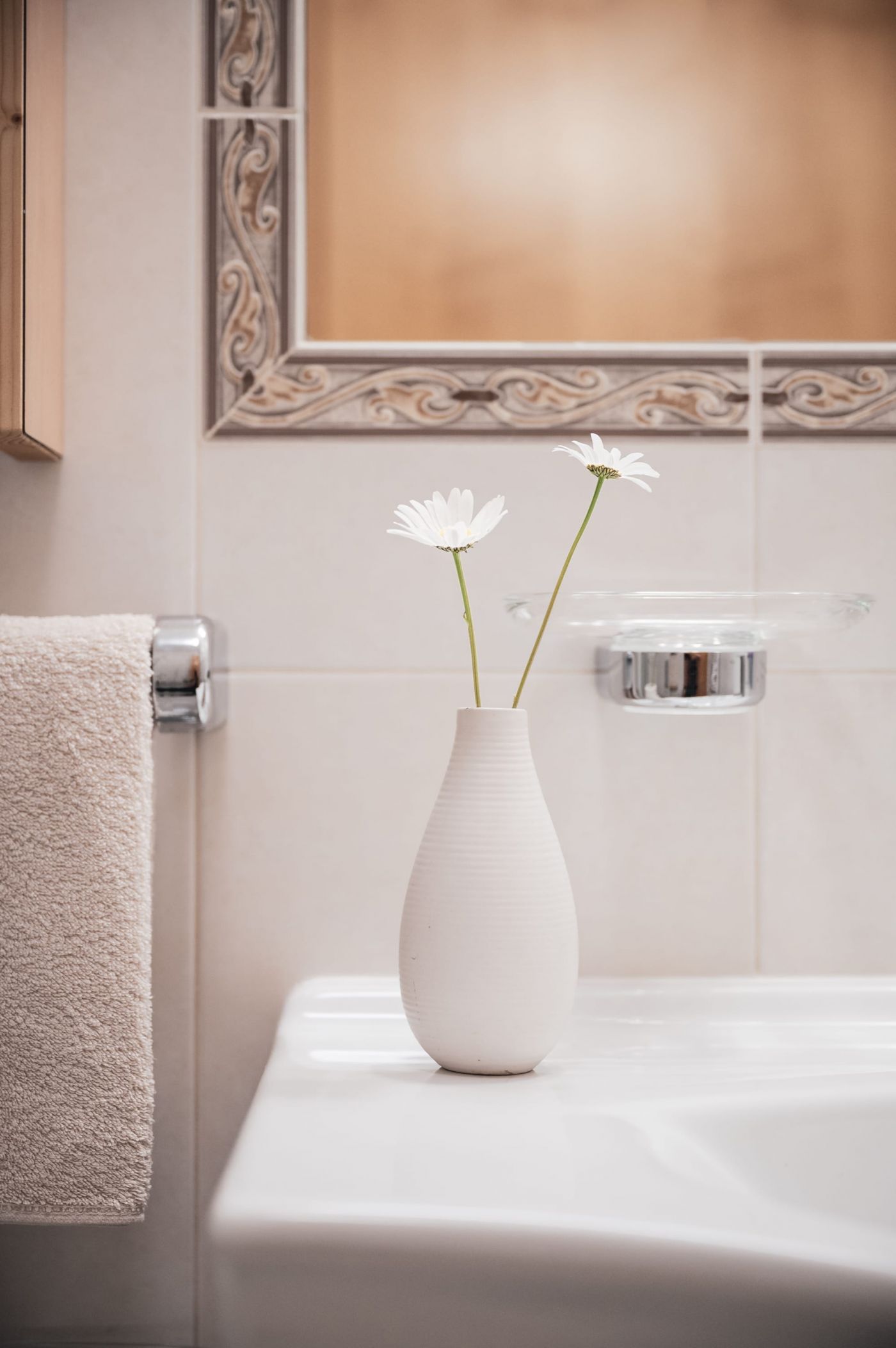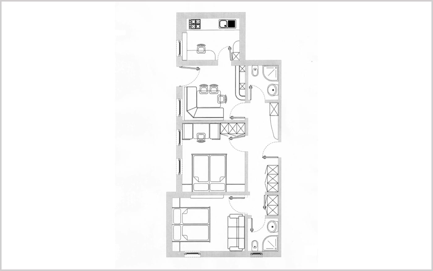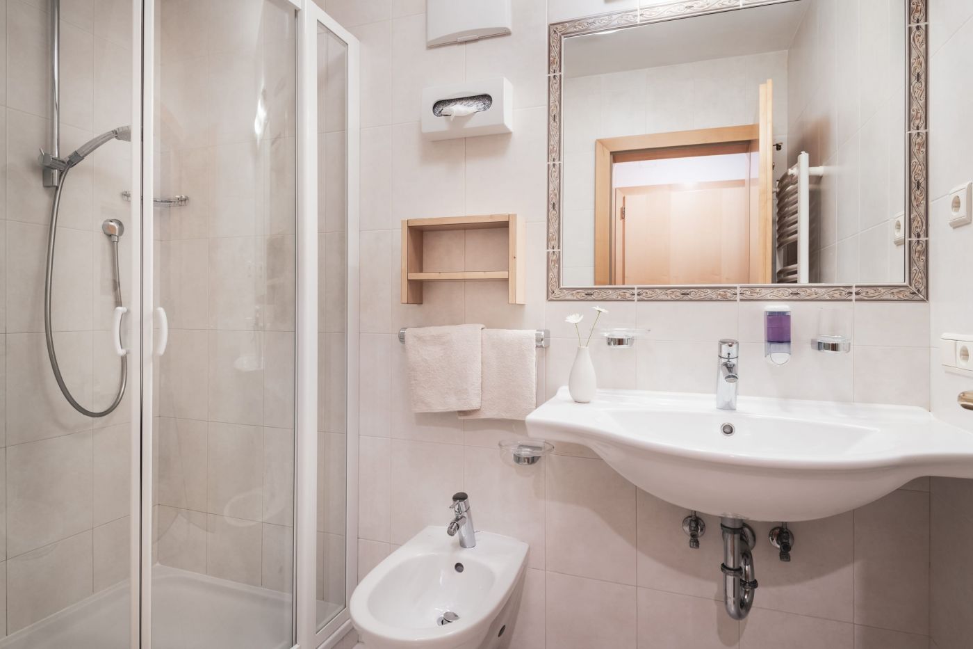 The ground floor apartment features two bedrooms, one double bedroom with additional bed and one double bedroom with a bunk. There are two bathrooms: a main bathroom furnished with shower, towel warmer, washbasin, hairdryer, WC and bidet, and a second bathroom with shower, WC and washbasin.