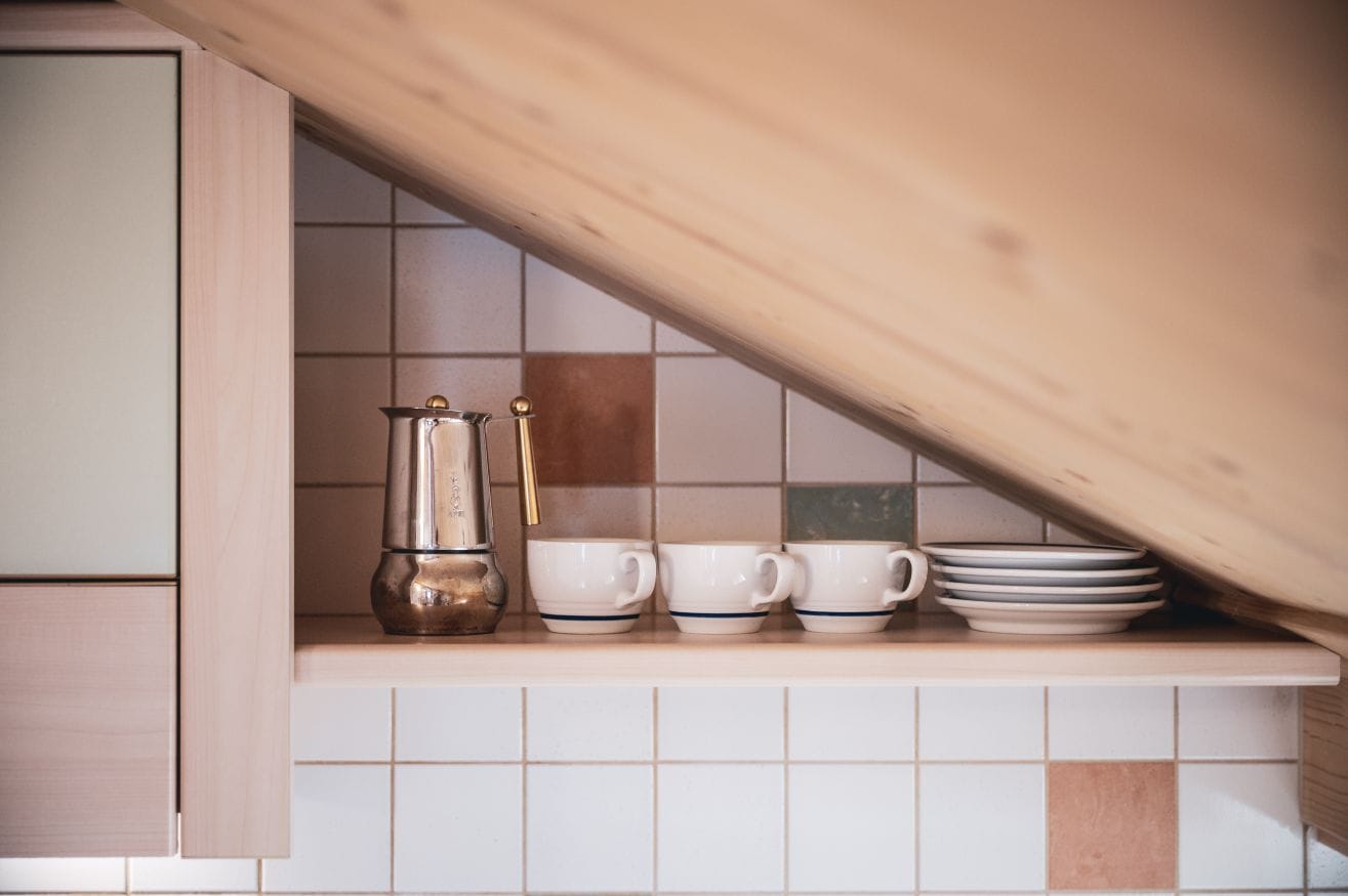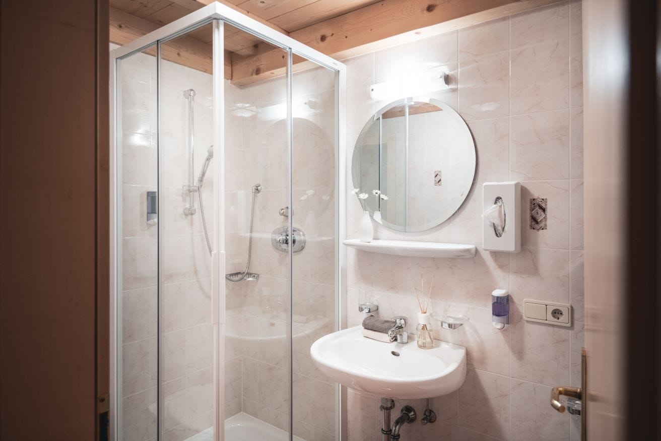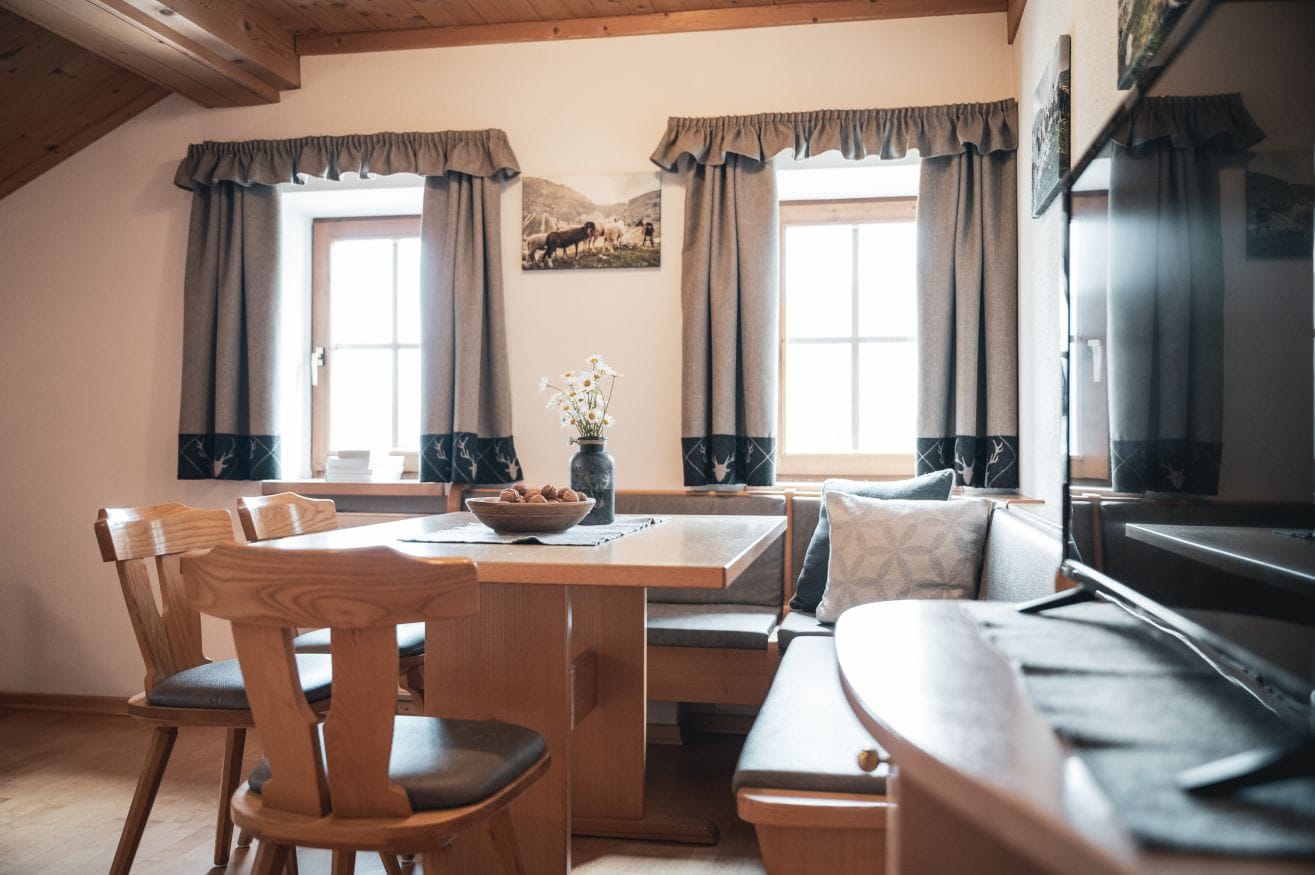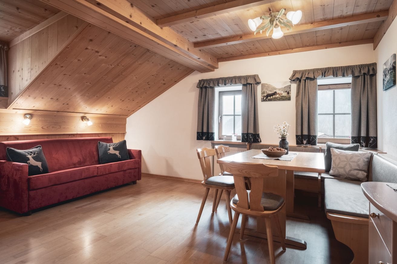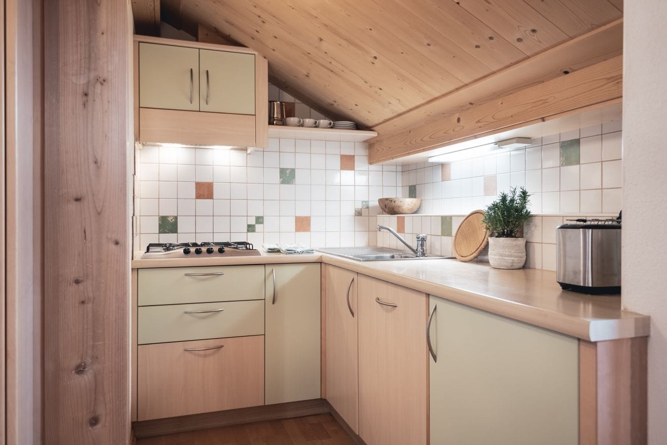 In the living room with TV/Sat and view on Colfosco, the sofa can be turned into a double bed. The kitchen is fully-equipped with gas stove, fridge and freezer, dishwasher with tabs, microwave oven, electric kettle and filter coffee machine.