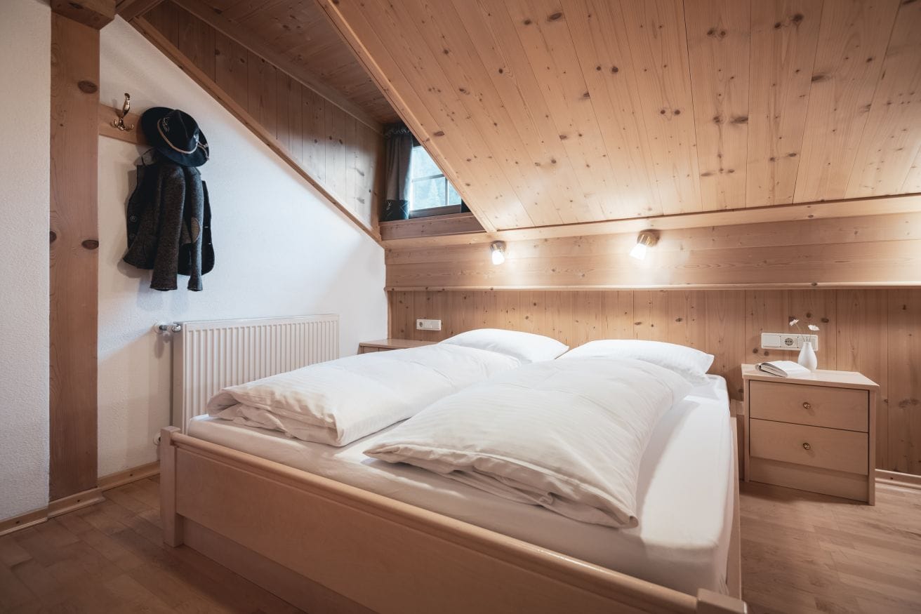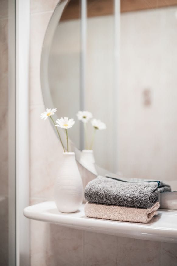 The first floor apartment features a double bedroom with additional bed and a bathroom furnished with shower, towel warmer, washbasin, hairdryer, WC and bidet.