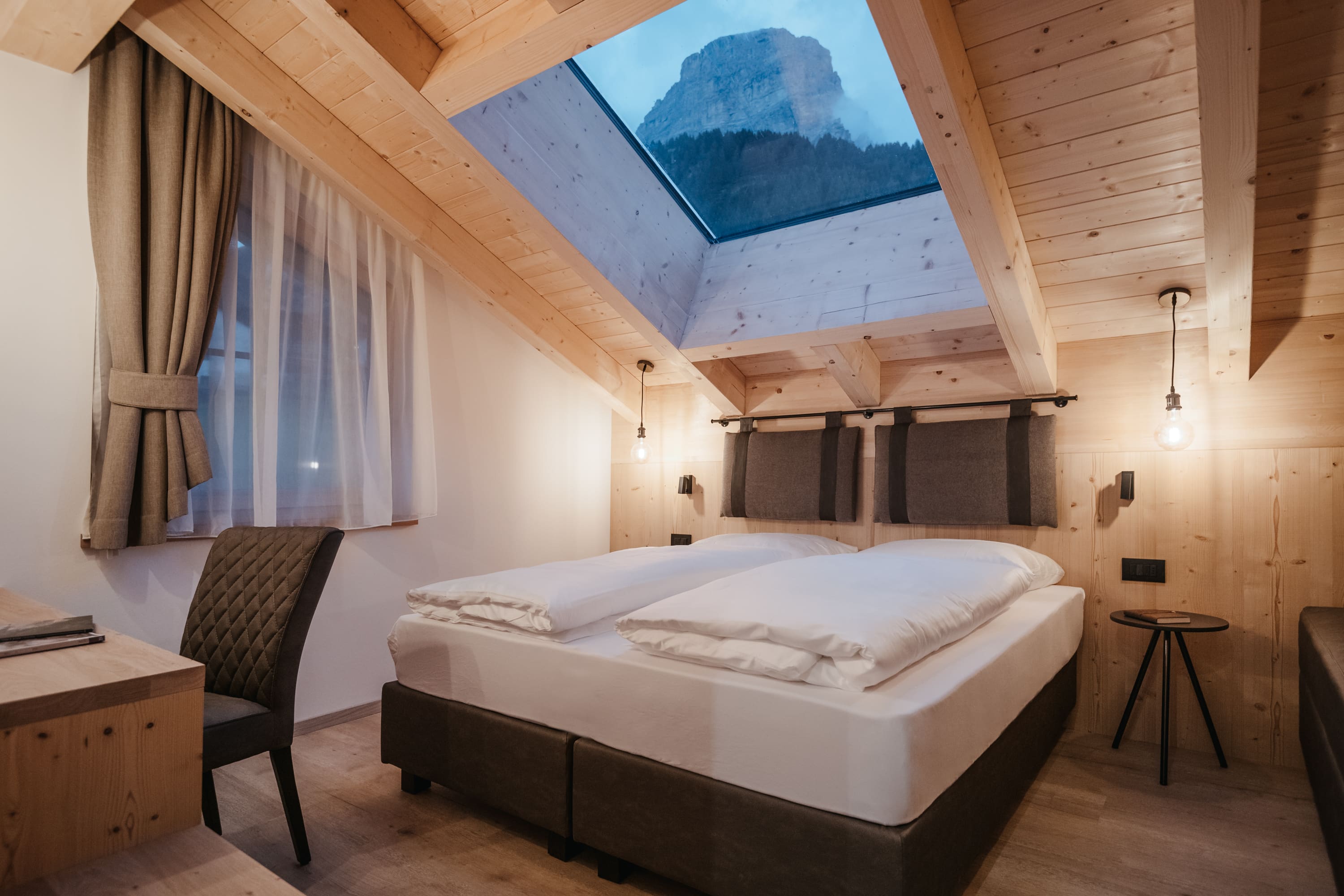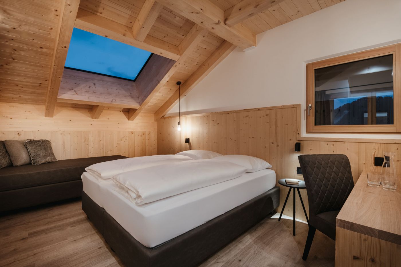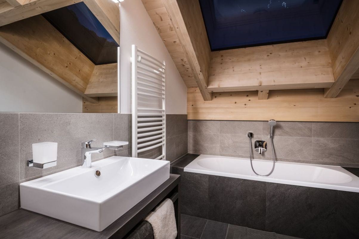 The attic features two double bedrooms with divisible beds, each with separate bathrooms furnished with bathtub or shower, towel warmer, washbasin, hairdryer, WC and bidet. If needed, there is also an additional bed in each room.
