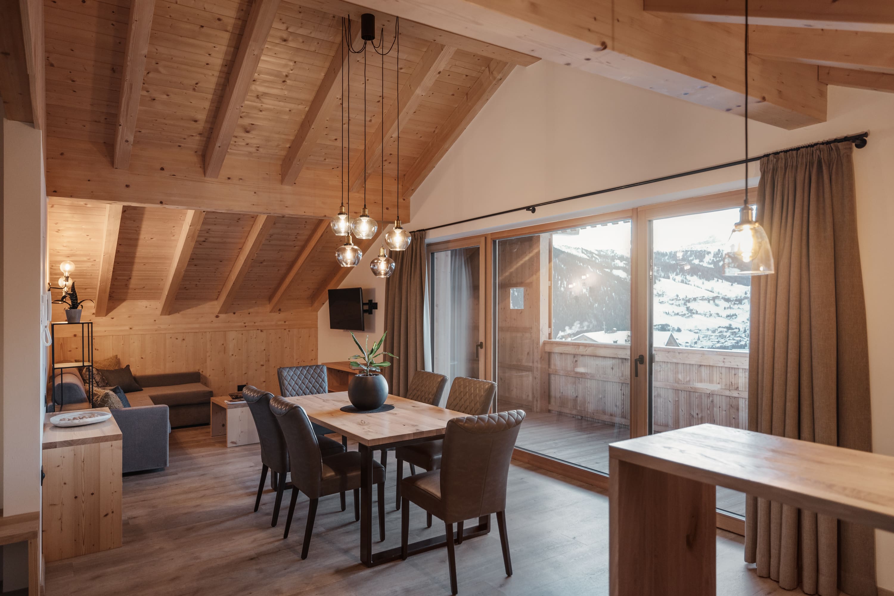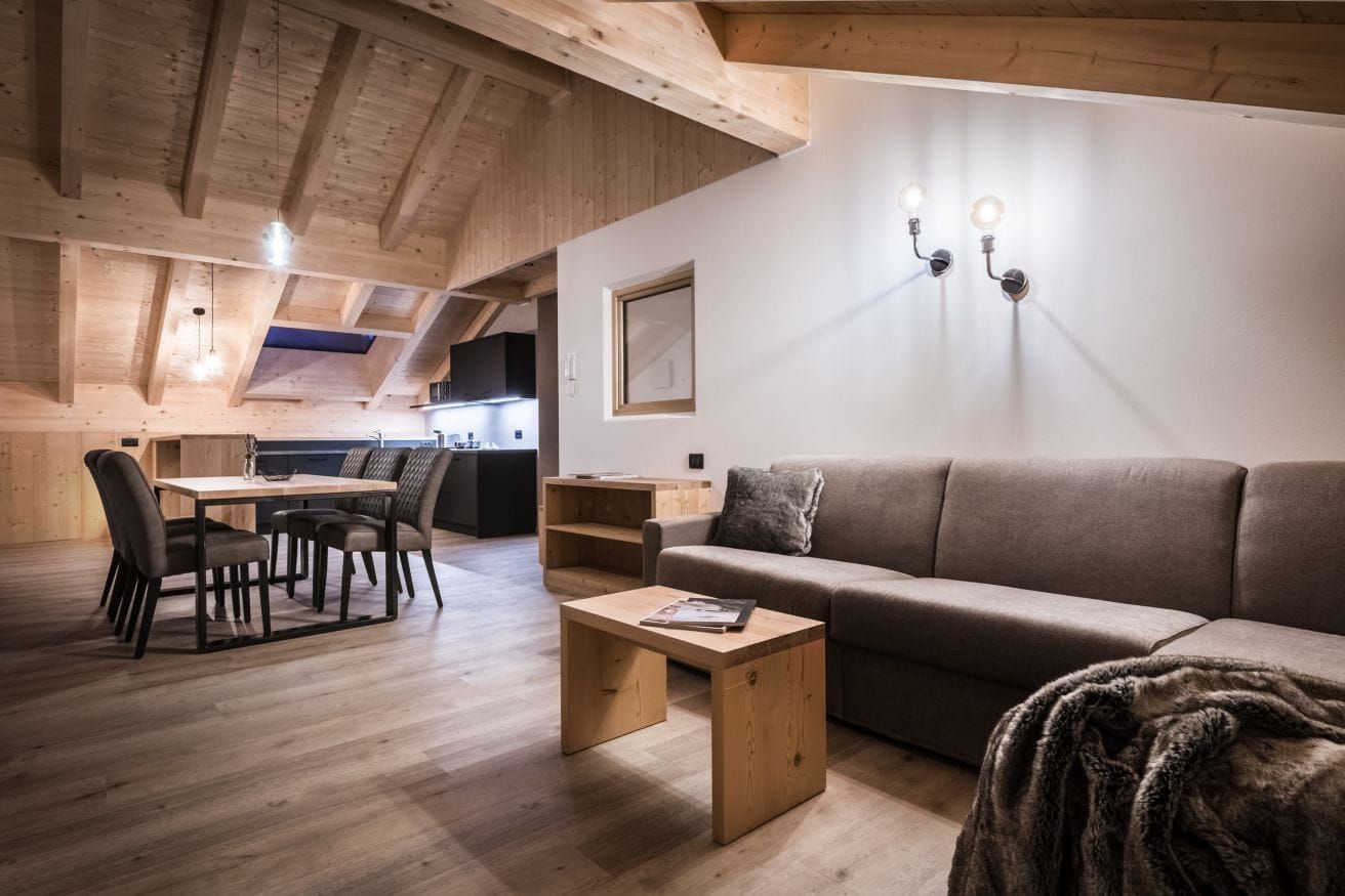 All floors are heated, and in the living room with TV/Sat the sofa can be turned into a double bed. The kitchen is fully-equipped with electric stove, fridge and freezer, dishwasher with tabs, microwave oven, electric kettle, filter coffee machine or coffee capsule machine. The kicker of the apartment are for sure the big glass windows and the wide south-facing balcony with charming view of the Sella group and of the towns of Colfosco and Corvara.