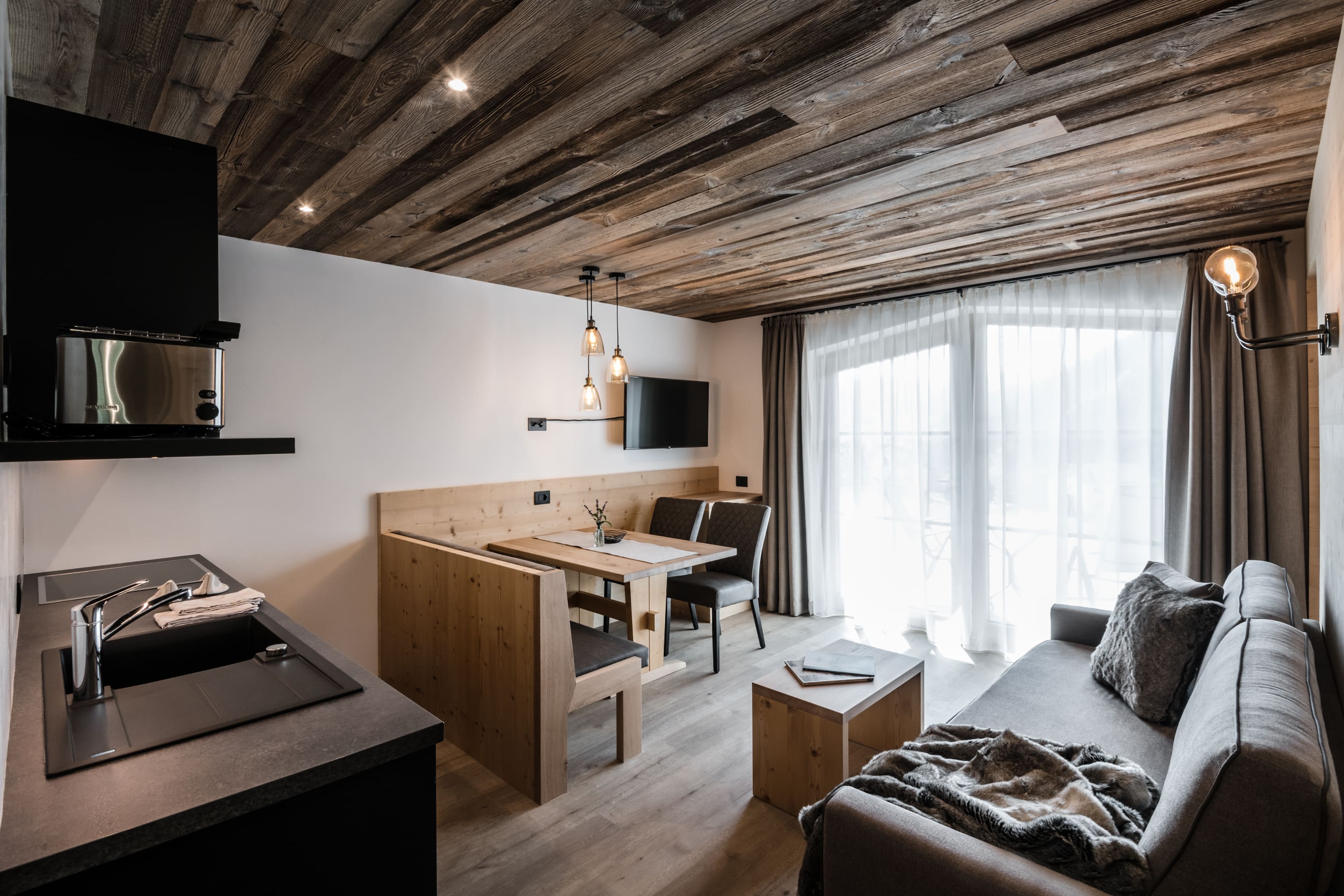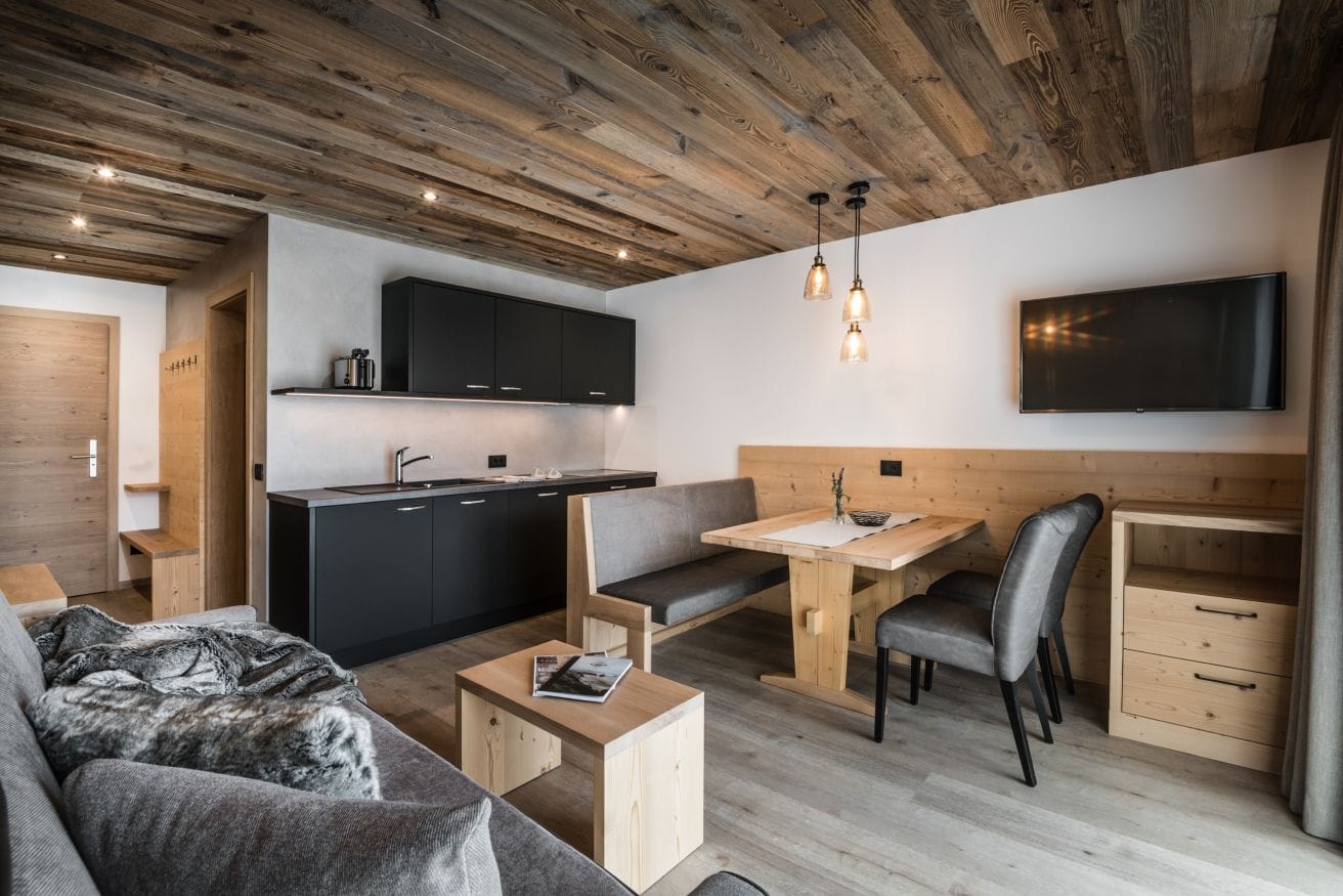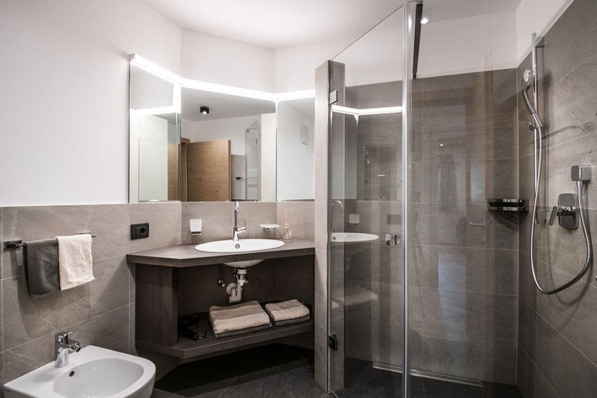 All floors are heated, and in the living room with TV/Sat the sofa can be turned into a double bed. The kitchen is fully-equipped with electric stove, fridge and freezer, dishwasher with tabs, microwave oven, electric kettle, filter coffee machine or coffee capsule machine. From the wide glass window you have direct access to the garden, from where you enjoy a panoramic view of of the Sella group.
