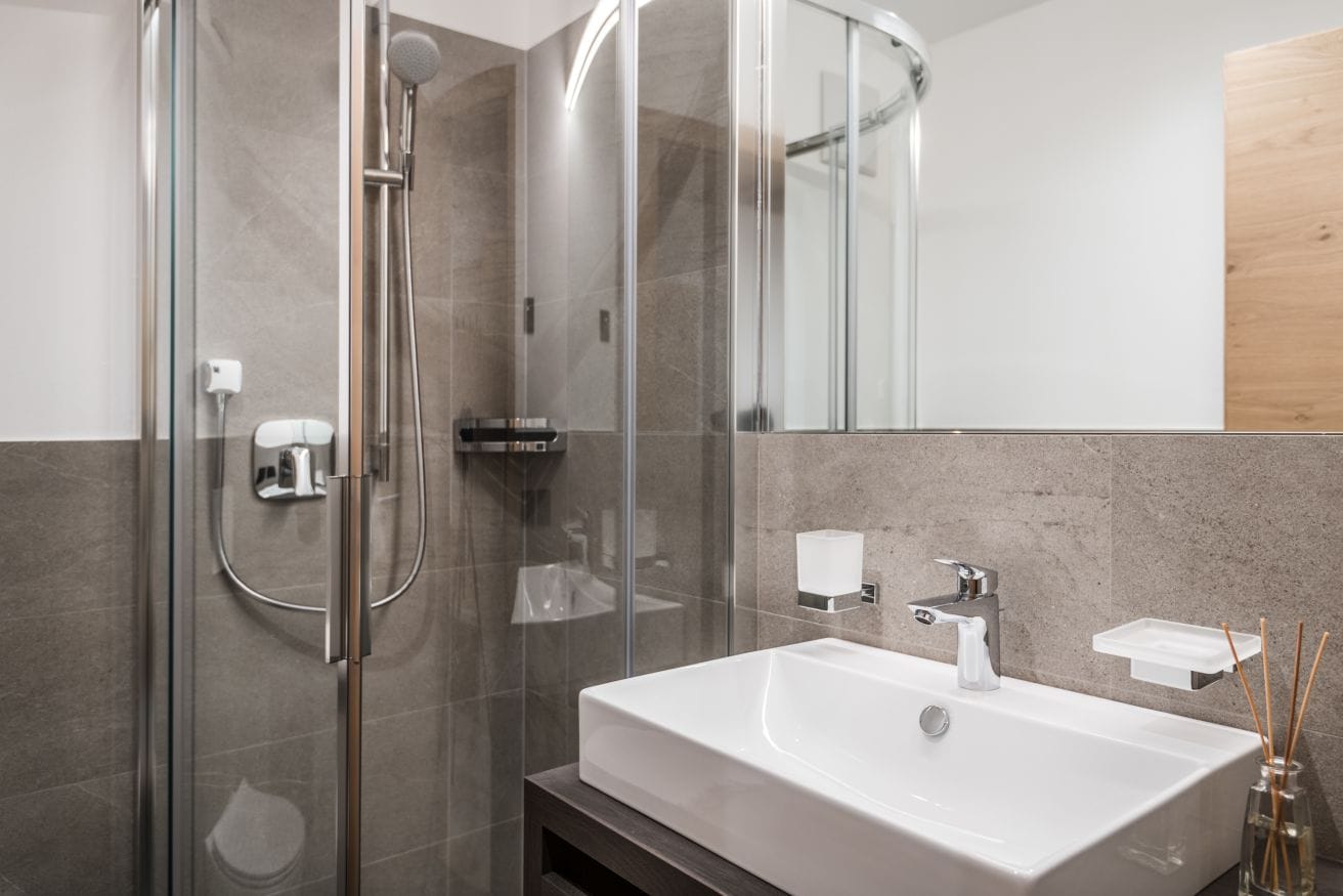 The ground floor apartment features two bedrooms, one double bedroom and one children bedroom with bunk bed. There are two bathrooms: a main bathroom furnished with shower, towel warmer, washbasin, hairdryer, WC and bidet, and a second bathroom with shower, WC and washbasin.